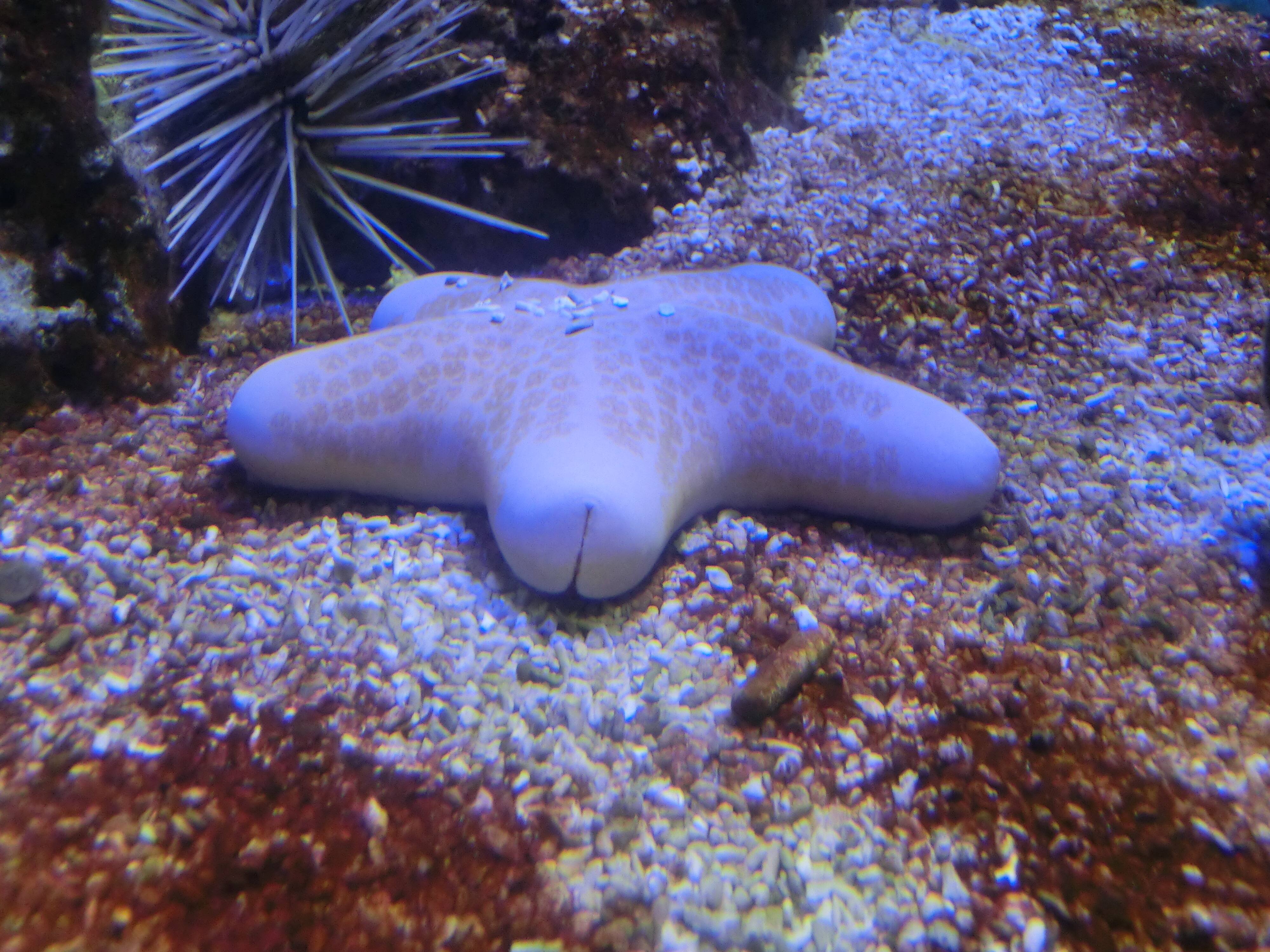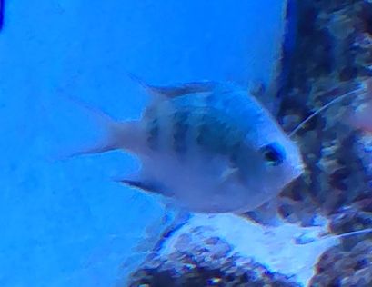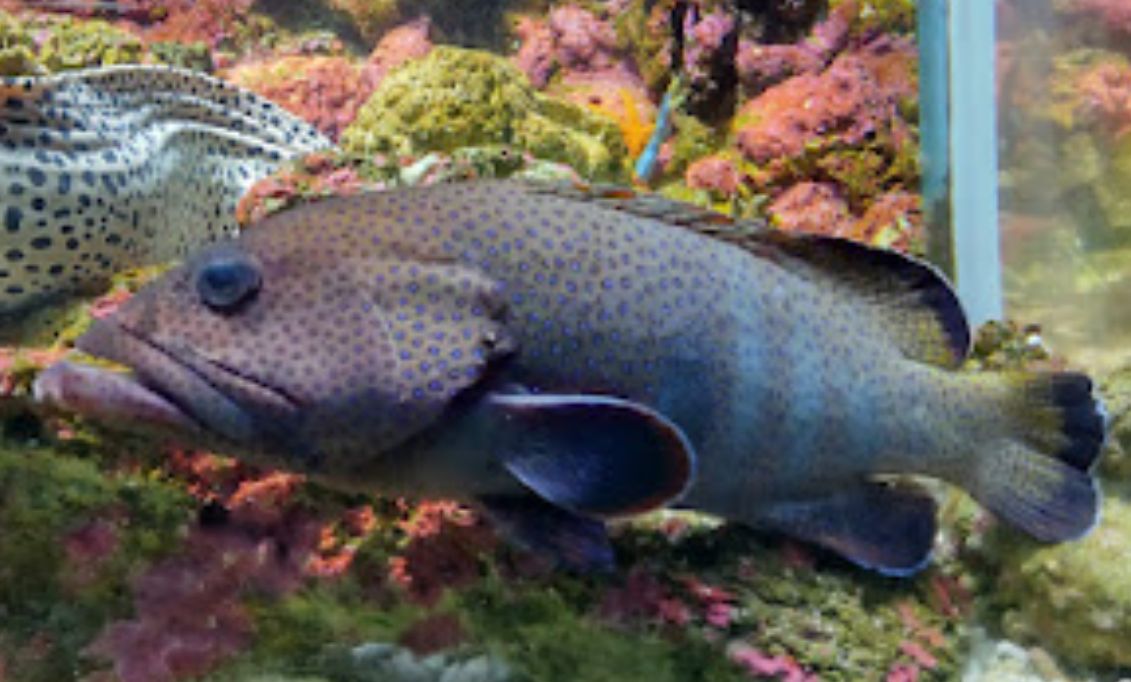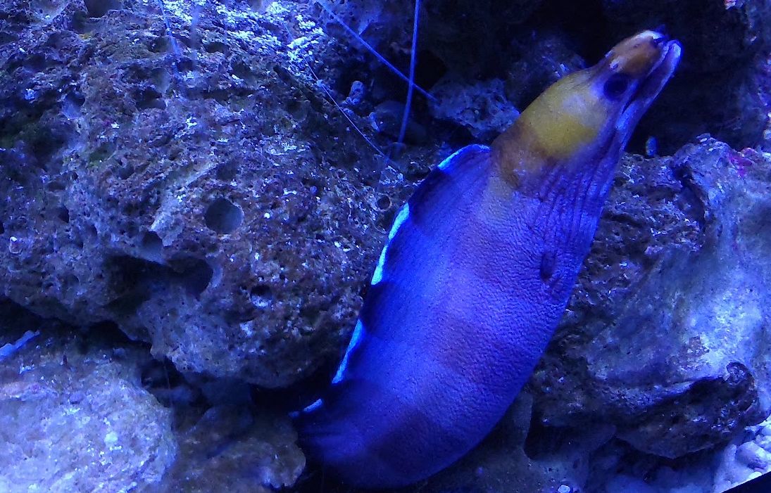 ウツボ科生息地:伊豆半島以南、西太平洋サンゴ礁域に多く見られますが幼魚は県本土でも時々見られるそうです。成魚は体中に黒点が散在していますが小さな個体では黒点は大きな黒斑となりぶち状の模様になります。ウツボの仲間の中では大型種で成長すると2m程になるそうです。2階奥のサンゴ礁の水槽では大きく成長したニ...