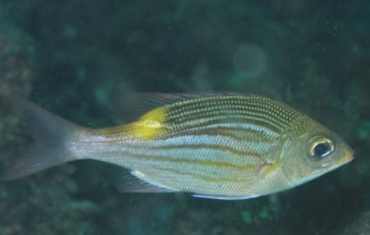 幼魚は腹部が白っぽく、黄色の背部に3本の黒い帯模様があります。
